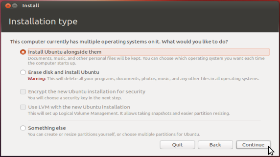 Installing ubuntu 18.04 on the thinkpad was a disaster. I wanted to dual-boot Ubuntu alongside windows. I’d bought the 1TB SSD model to keep Windows around for the occasional customer visit where screen sharing requires installing a .exe from cisco (this is a thing I promise). It turns out that if you start installing ubuntu 18.04 but abort the installation at this step (clicking Quit), and are on a machine with secure boot, something terrible happens. I don’t really understand secure boot, but there’s some area on the machine where the OS can set “EFI variables”, and by getting to this point in the install you’ve set some, including something that tells the bootloader to try to load mmx.efi. You can read about the problem here.